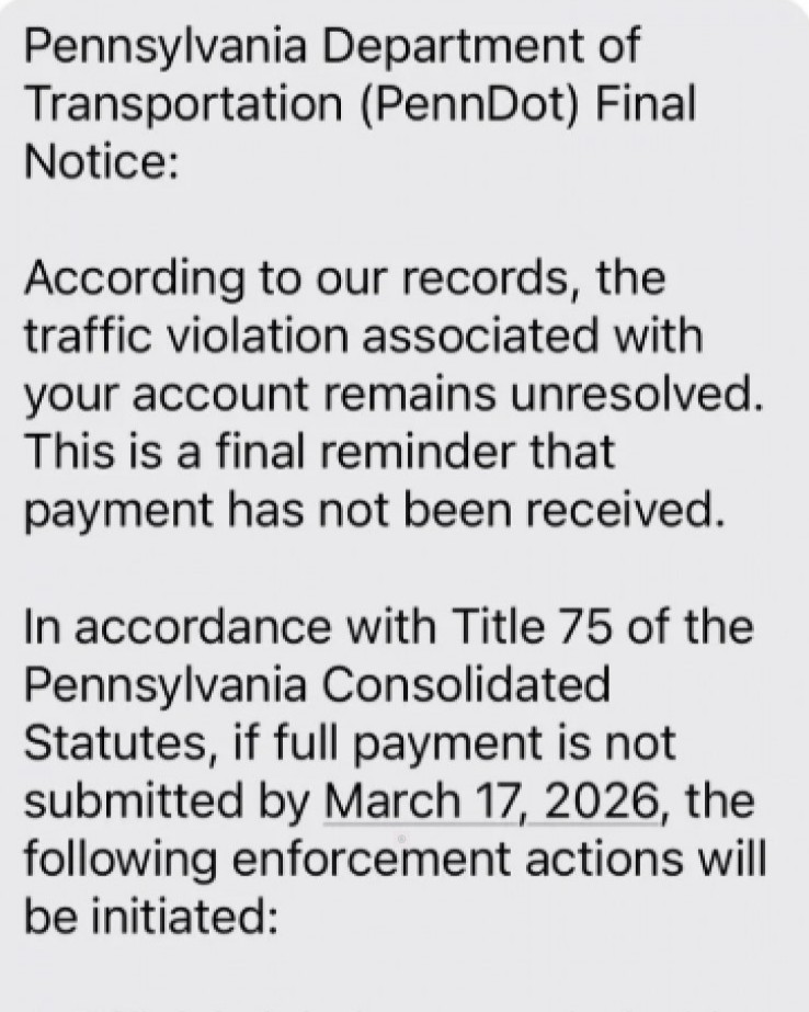 The Senate approved legislation to ensure volunteer fire and EMS personnel are covered by workers’ compensation if injured participating in the fundraising activities essential for covering the costs of providing public safety. A 1980 court decision held that firefighters injured at their annual fundraising picnic were eligible for workers’ compensation because members were covered for all activities authorized by a municipality. However, current law does not provide the same coverage for the full scope of fundraising activities. Senate Bill 1053 would fill the gap, expressly providing workers’ compensation for volunteers’ participation in fundraising activities. The bill was sent to the House of Representatives for consideration. Scam Alert!The Pennsylvania Department of Transportation (PennDOT) is urging anyone who receives a suspicious text message to avoid clicking on any links. PennDOT has recently received reports of scammers trying to impersonate PennDOT or the Department of Motor Vehicles to obtain personal information, such as bank account information. PennDOT does not send texts about traffic violations or fines. Please be alert of this scam! Legislation Giving Farmers More Vehicle Flexibility Approved by Senate