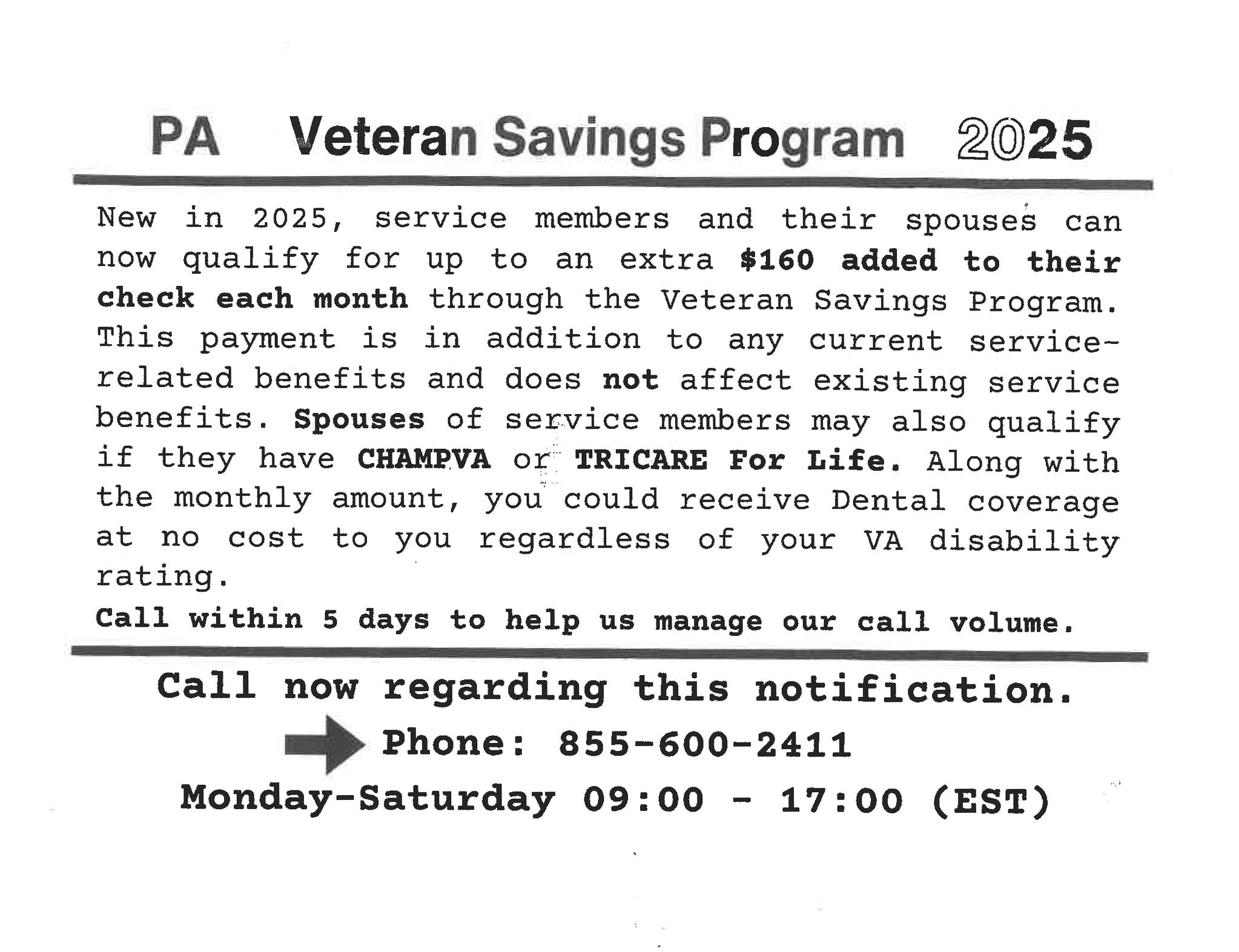 Veterans and their families continue to be targeted by increasingly sophisticated scams designed to steal personal information, benefits, and hard-earned savings. In recent years, these fraudulent attempts have grown more common, threatening the financial security of those who have served our nation. The latest scam circulating in Pennsylvania involves a direct-mail postcard claiming to offer eligible Veterans an additional $160 per month through something called the “PA Veteran Savings Program 2025.” The postcard appears official at first glance, using formal language and referencing programs such as CHAMPVA and TRICARE for Life. It urges recipients to call within five days to “help manage call volume,” a tactic often used to pressure Veterans into responding quickly. However, the postcard contains several red flags. It does not include a return address, and it lists a bogus phone number — 855-600-2411 — designed to lure callers into sharing personal information. Veterans who receive suspicious mail or believe they may have been targeted by this scam, or a similar one should report it immediately to: